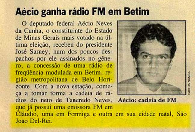 A imagem aí de cima é de um trecho da coluna Radar da revista Veja de 18 de fevereiro de 1987. Como se vê, ela informa que o à época presidente da República José Sarney deu de brinde ao à época deputado federal e hoje senador por Minas Gerais Aécio Neves "a concessão de uma rádio de frequência modulada em Betim, na região metropolitana de Belo Horizonte". Informa ainda que Aécio já era proprietário de outras três, em Cláudio, Formiga e São João Del-Rei.